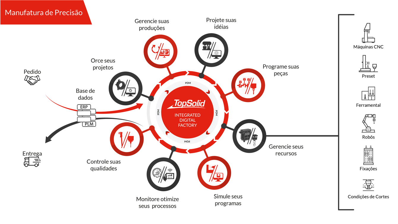 Você é um profissional do setor procurando por uma solução CAD/CAM/ERP? O TopSolid é uma solução única, confiável, completa e produtiva. Sua gama de produtos é uma solução muito poderosa de modelagem, produção e gerenciamento que irá atender suas necessidades de produção, seja qual for seu setor de atividade.