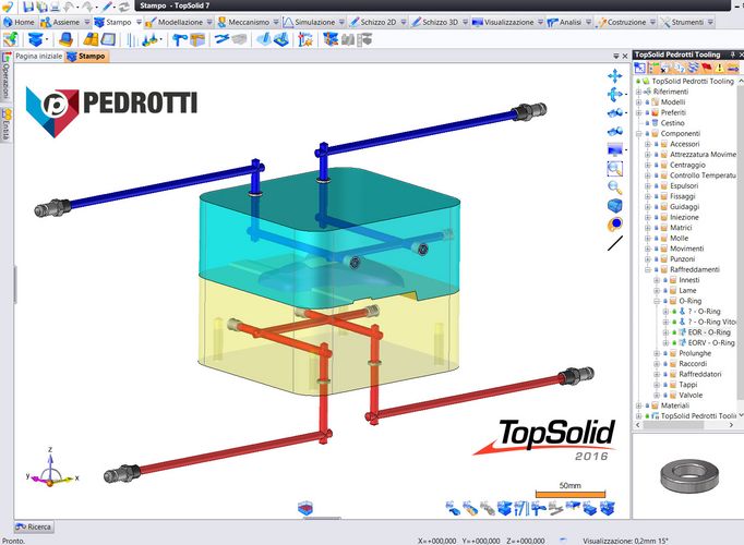 "TopSolid’Mold è in assoluto fra i più utilizzati software di modellazione per stampi, grazie a interfacce dati con i principali CAD del mercato, alle messe in tavola dettagliate e specializzate per gli stampi con la quotatura automatica dei fori ed una distinta base classificata con indicizzazione adattabile, fino alla gestione delle multi-impronte e delle versione stampi, indispensabile ormai in ogni settore. Velocizza la progettazione dei blocchi impronta permettendo una gestione globale o differenziata del fattore di ritiro e fornendo analisi immediate delle spoglie e sottosquadri; rileva e propone in modo automatico le linee di chiusura ed assiste l’utente nella creazione delle superfici di chiusura. I canali di raffreddamento sono creati in modo semplice, sfruttando le potenzialità dello sketch 3D. Creato il circuito, gli elementi selezionati vengono aggiunti automaticamente, a completarne la progettazione", afferma Marco Zoia, Product Manager di Pedrotti.