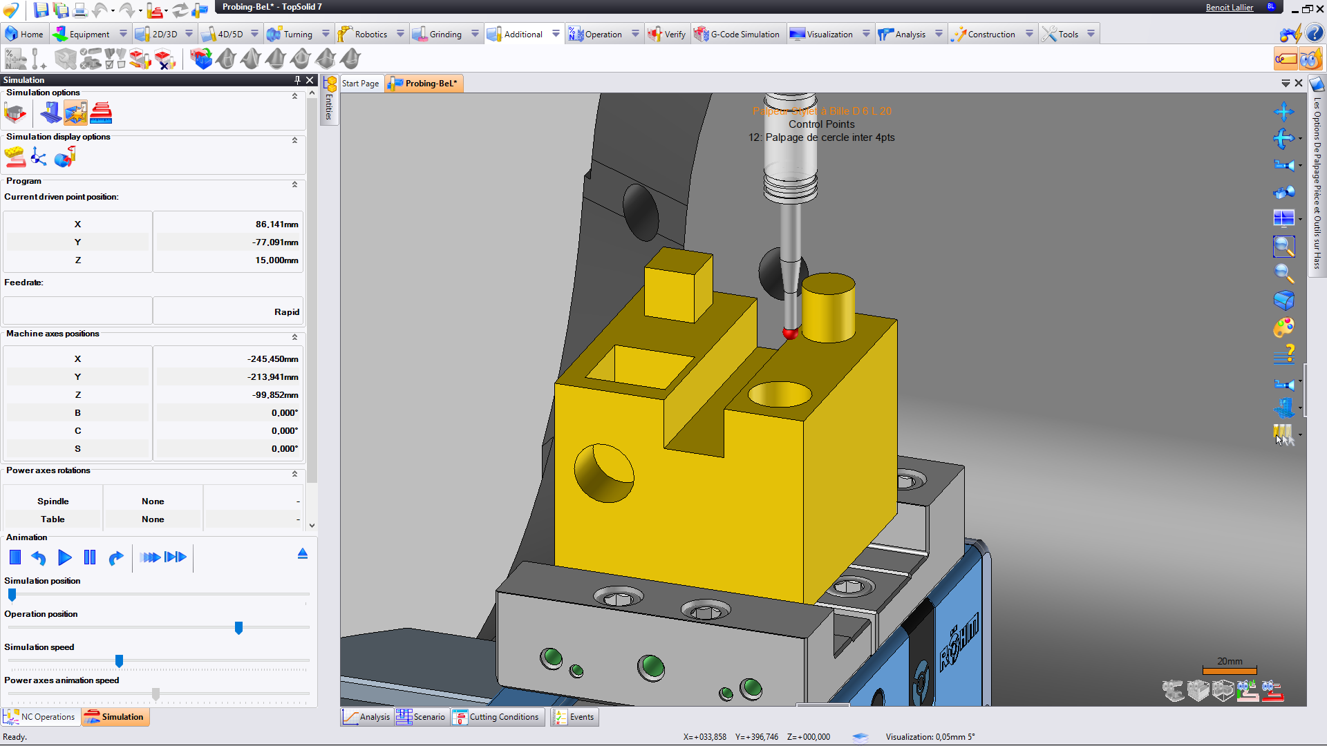- Analysis: find all the machinable shapes (facing, pocketing and contouring) in automatic according to the limitations of the machine to machine them directly *