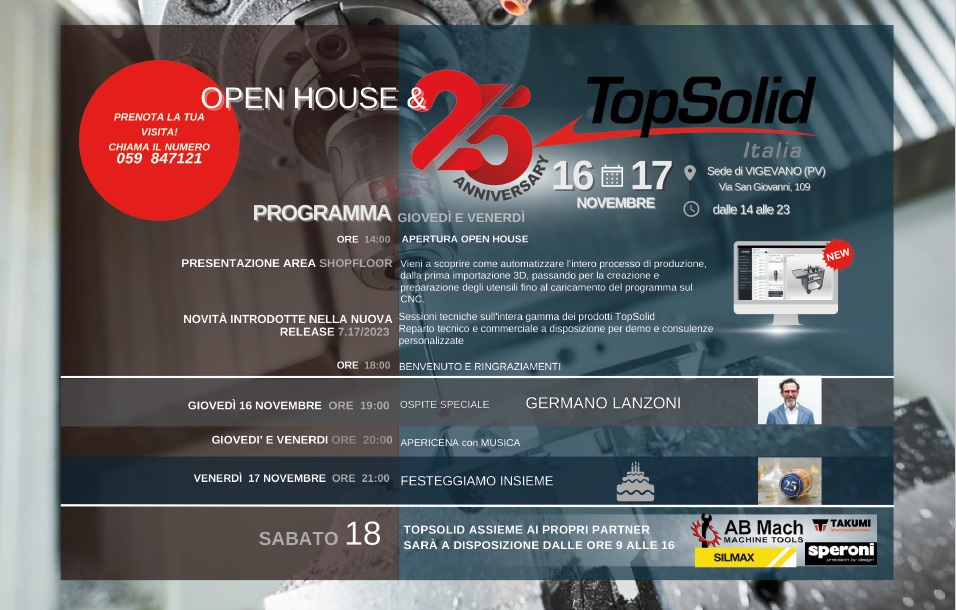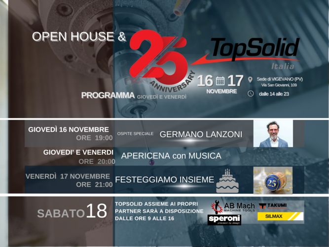 TopSolid'Italia festeggia i suoi 25 anni di presenza sul territorio italiano con un evento da non perdere. Cogliamo l'occasione per inaugurare la nostra Showroom permanente presso la filiale di Vigevano, dove potrete scoprire il nuovo e rivoluzionario prodotto TopSolid'ShopFloor.