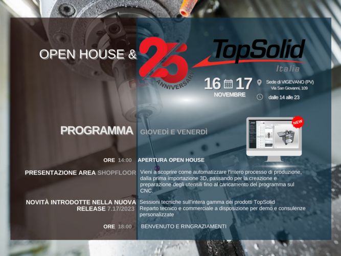 TopSolid'Italia organizza un OPEN HOUSE presso lo stabilimento di Vigevano per festeggiare i 25 anni di vita e condividere con i propri cliente l'inaugurazione della Showroom TopSolid'ShopFloor. La filiale italiana nasce nel 1997 e durante questo quarto di secolo, la società ha soddisfatto più di 2.500 aziende italiane offrendo un prodotto ed un servizio sempre più apprezzato sul nostro mercato. Dalla versione 6.3 all'attuale versione 7.17, tutti i dipendenti della società hanno permesso a molte realtà dell'industria italiana di aumentare la produttività e la qualità ottimizzando i processi.