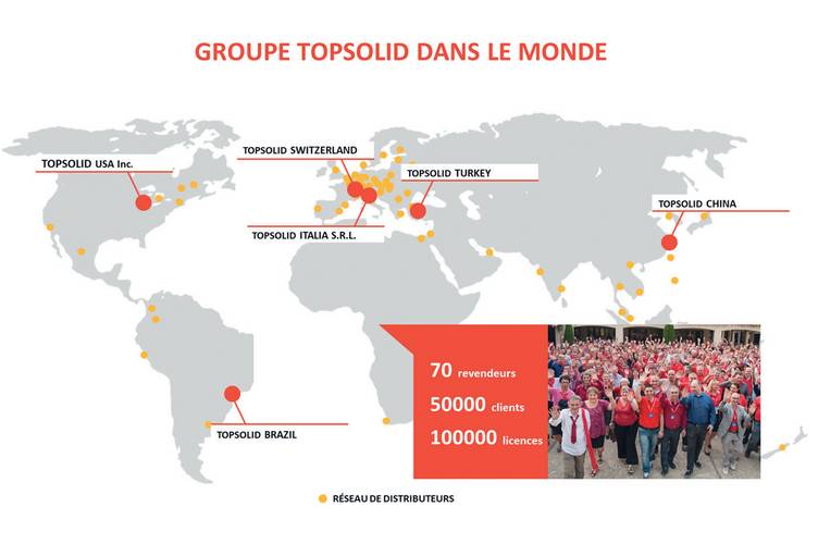 TopSolid has been implementing an international strategy for 15 years now. 50% of our revenues now comes from international markets. With our 70 distributors, more than 600 people contribute to the worldwide success of TopSolid every day. Our international customers include Koening & Bauer, Trumpf, Liebherr, Ricoh and many more groups of worldwide renown.