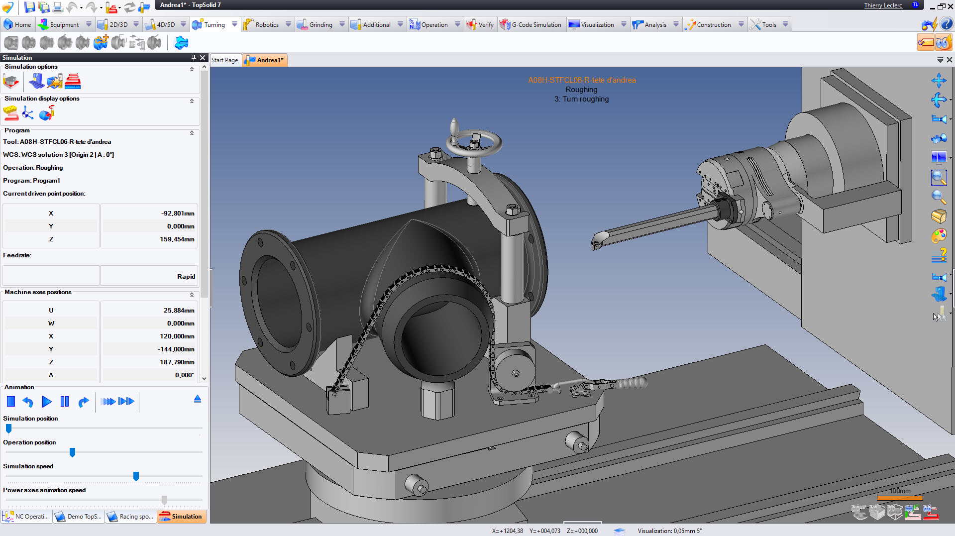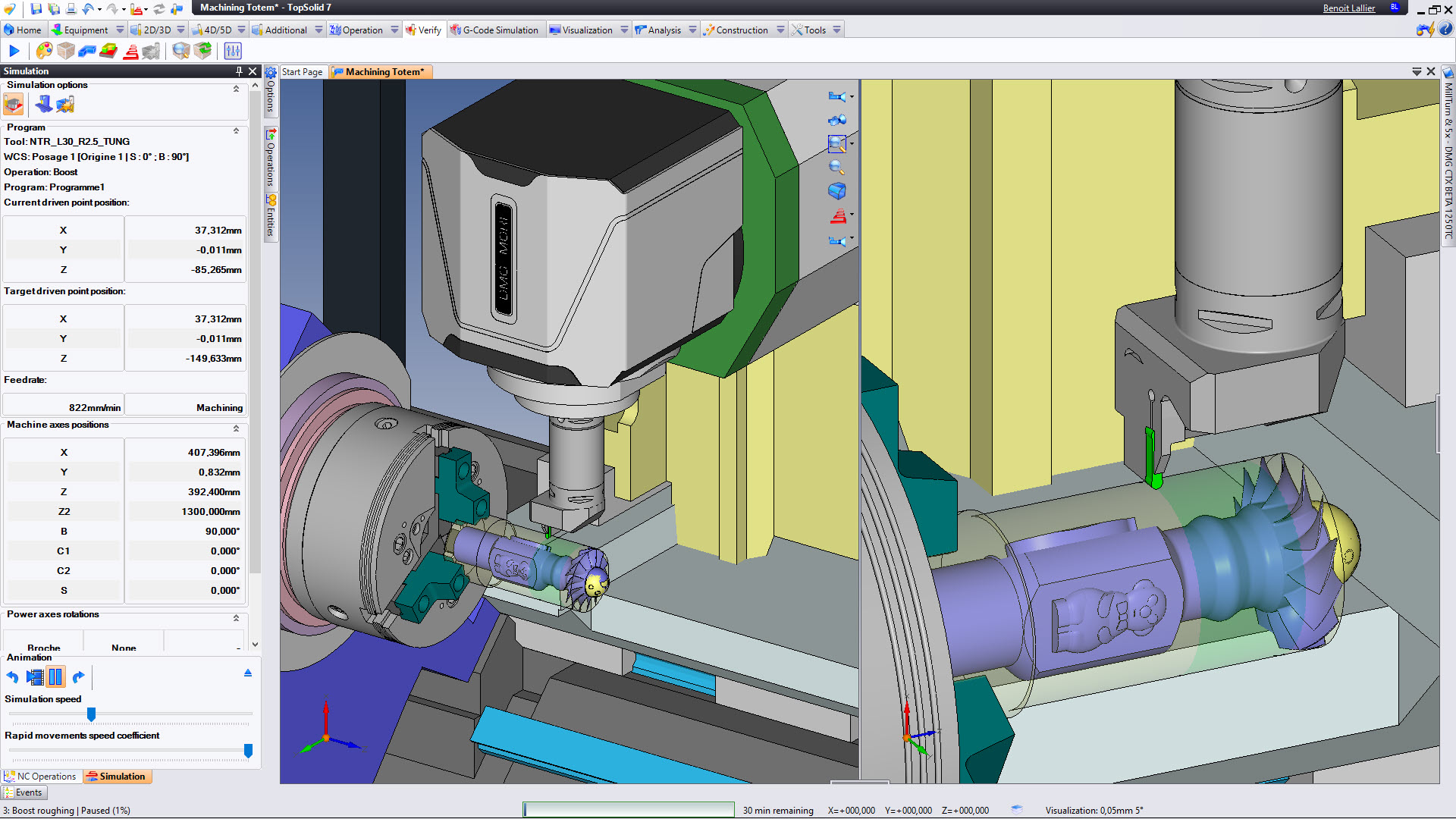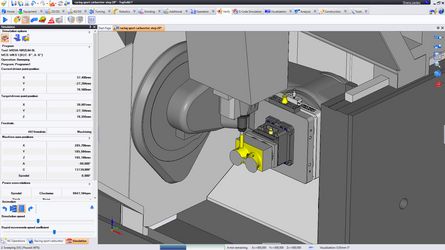 - A level of simulation of the ISO code to verify the movements of the machine taking into account the macros (tool change, tilted plane matrix, etc.) as defined on the machine in the workshop.