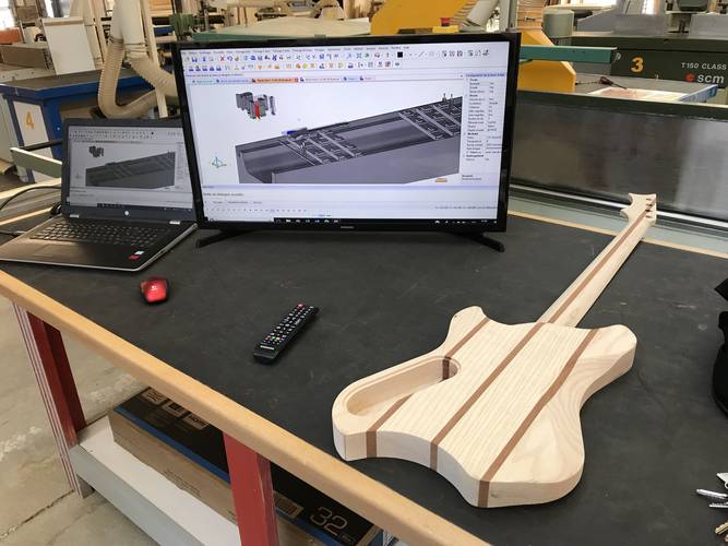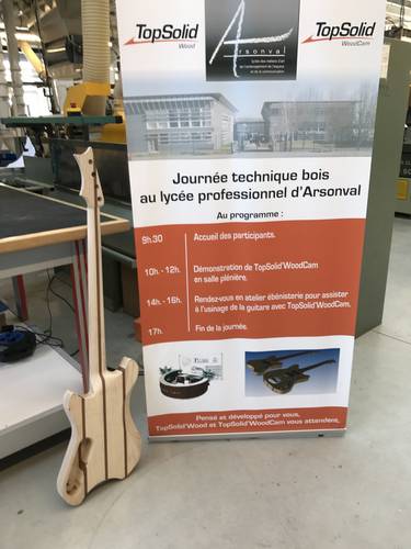 Elles ont été présentées avec beaucoup de compétence et de pédagogie et cela a permis de faire une démonstration pratique de la chaîne numérique entre le fichier 3D généré avec le logiciel TopSolid, le transfert et la simulation sur la machine, et l’usinage de la pièce finale (la guitare électrique TopSolid), objet que l’on a déjà eu l’occasion de voir sur différents évènements.