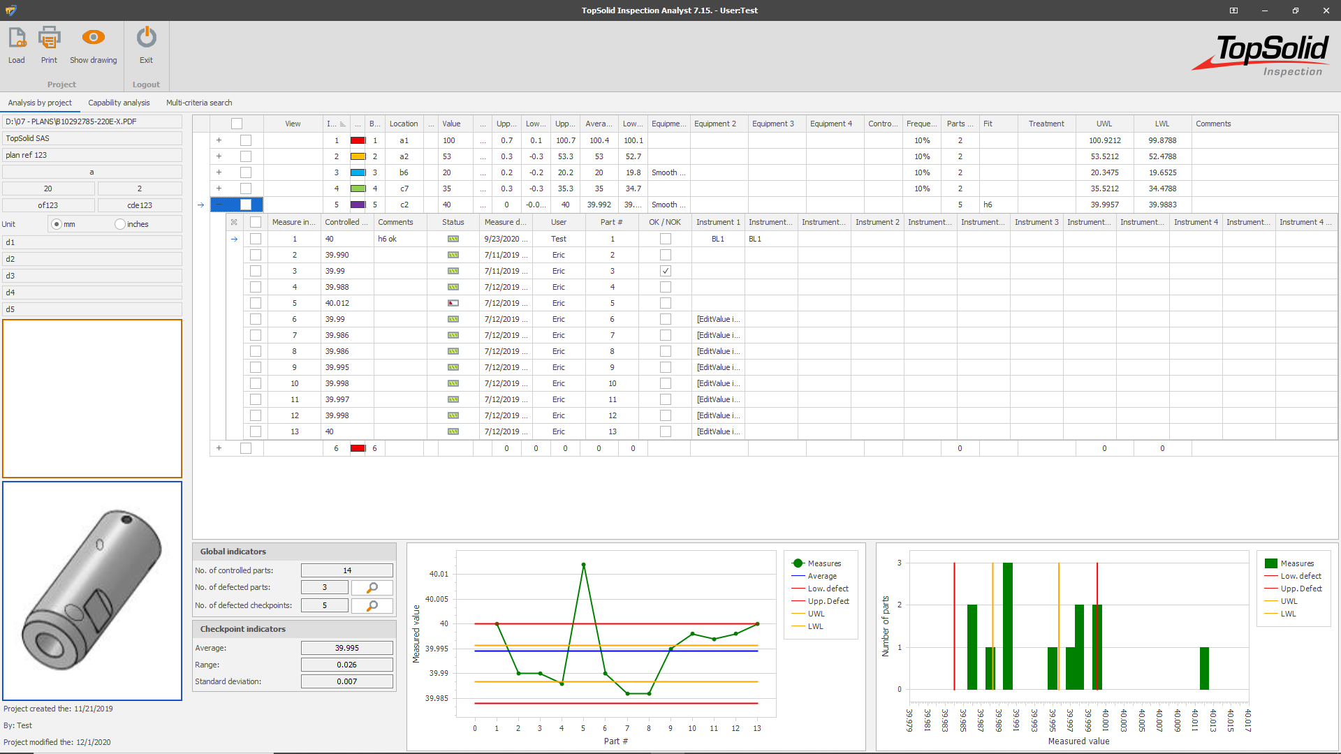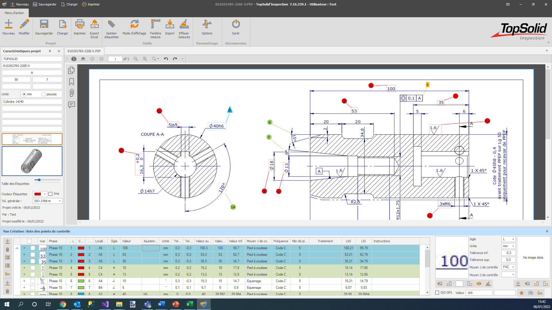 The part drawing in image, scan, TIFF, PDF, DXF and DWG format is integrated into the application at the inspection project level where the characteristics specific to manufacturing are defined (customer, order, production order, quantity of parts produced, serial numbers, etc.).