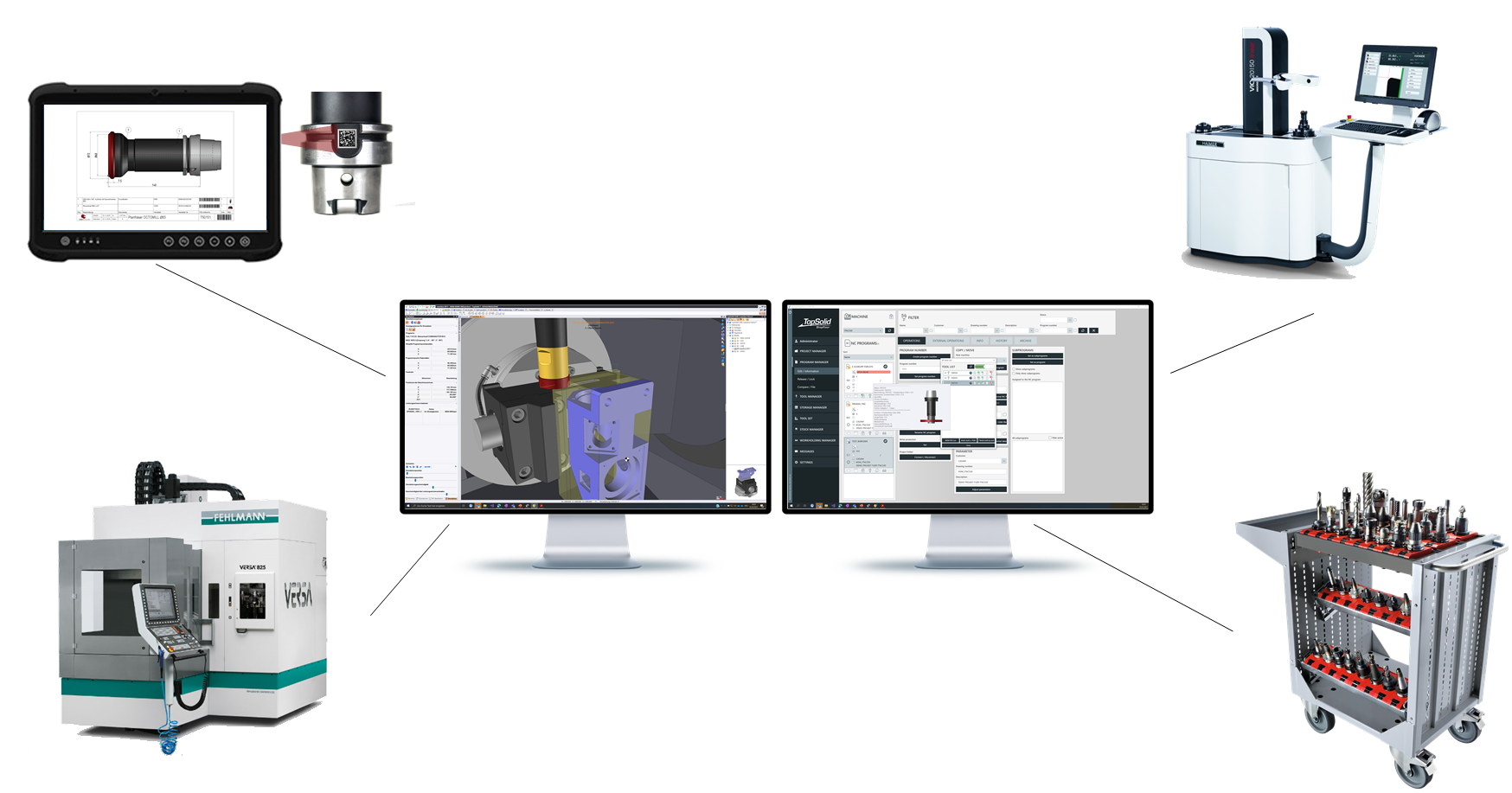 Darüber hinaus sorgt TopSolid'ShopFloor für die Verbindung mit allen Systemen in der Produktionsumgebung (CNC-Steuerungen, Voreinstellgeräte, Lagersysteme, etc.)