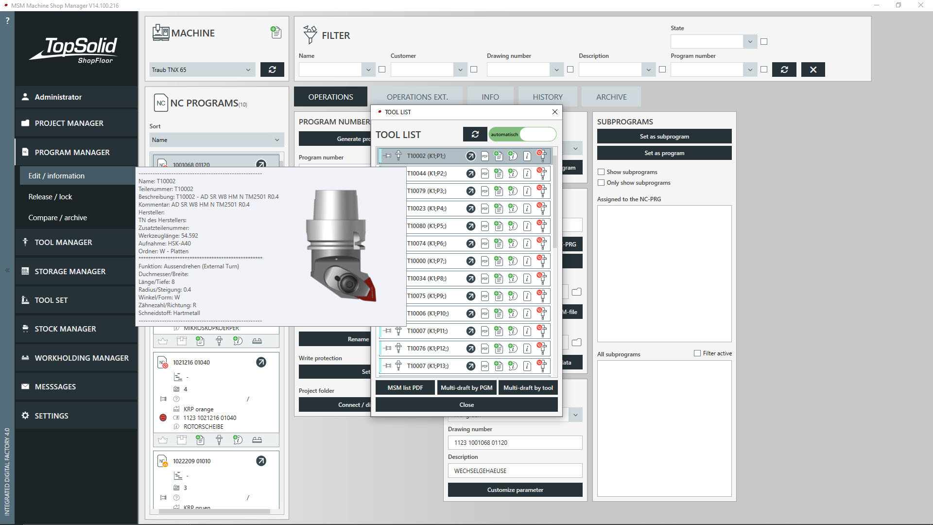 With the Program Manager module, you can manage all your NC programs, whether they are produced by TopSolid or not, as well as the manufacturing data attached to them.