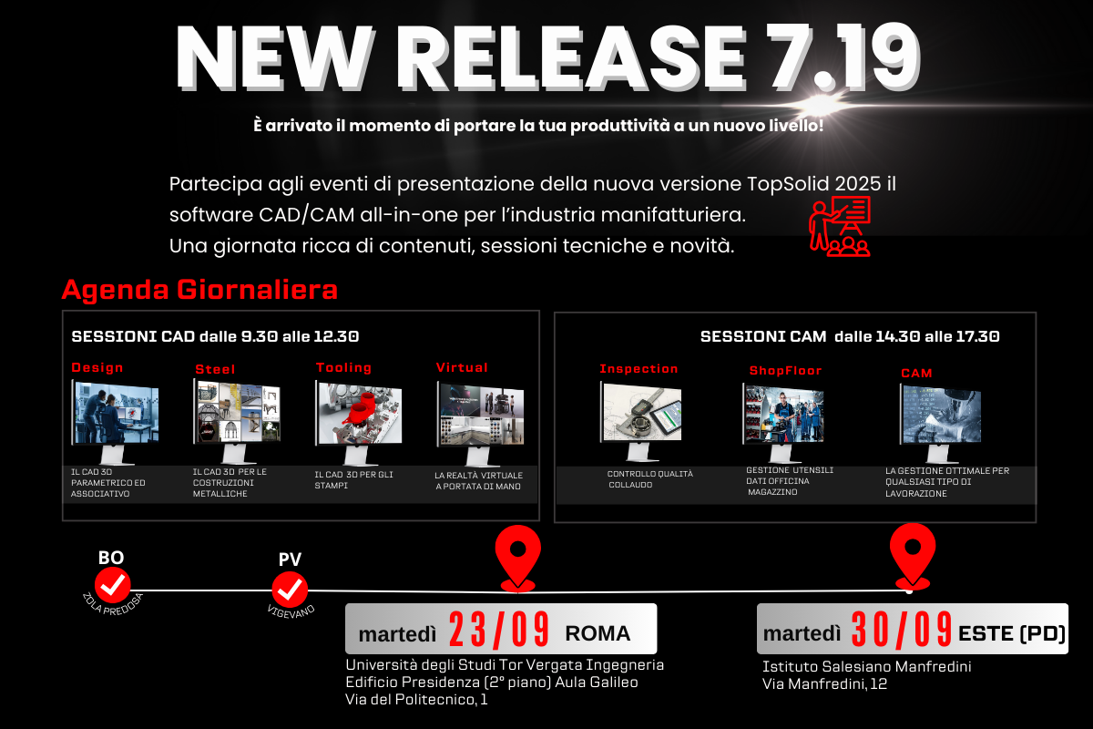 Si riparte in giro in varie città con gli eventi "TOPSOLID'DAYS". Queste giornate UTILIZZATORE/ FORNITORE sono sempre state gradite dai clienti e consentono di scoprire tutte le novità che la nostra R&D ha integrato nella nuova release della soluzione integrata CAD/CAM/PDM TopSolid.